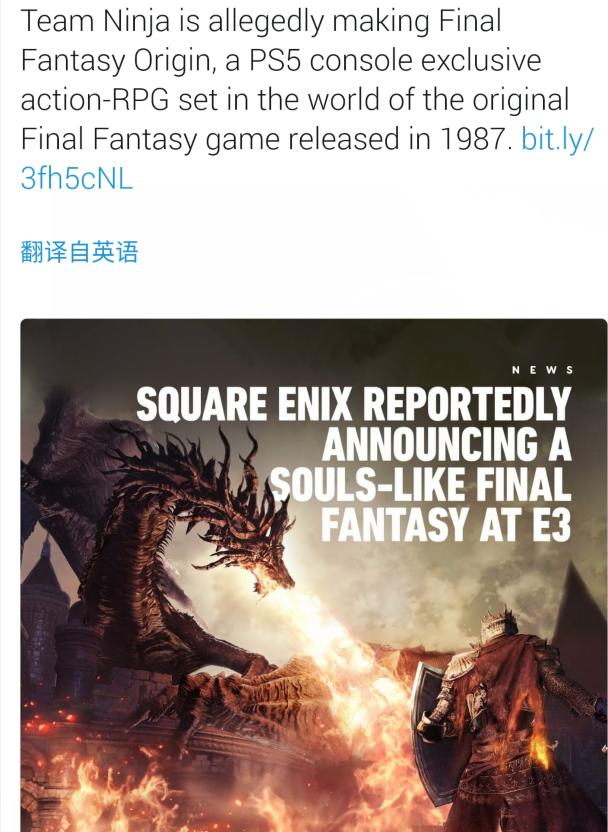 另一则消息称:忍者(ninja)团队正在开发一款PS5平台独占的动作类RPG新作《最终幻想:起源》(final fantasy:origin)游戏具体内容将在今年的E3游戏展会上公布,据悉该游戏采用《最终幻想》类题材,并由《仁王》《忍者龙剑传》开发团队team ninja负责开发。该游戏受到宫崎英高的“魂类游戏”的启发,很有可能是一款类魂动作角色扮演游戏,游戏将在E3结束后在今年夏天放出试玩版收集玩家测评反馈。(看到《仁王》和《忍龙》我就发现这游戏没那么简单。。。)