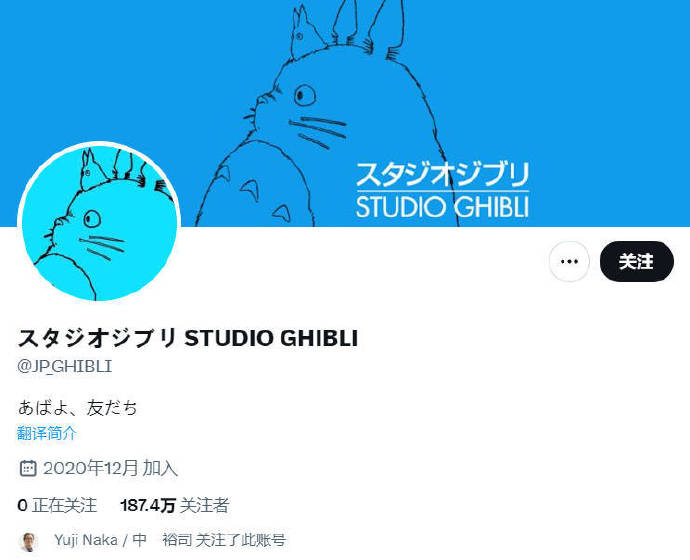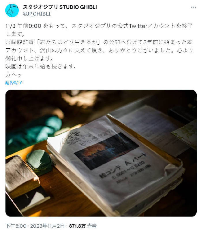 吉卜力工作室关闭账号 叽哩叽哩日报 2年前 AL6 吉卜力工作室官推宣布,官方推特账号将于明日(11月3日)11点关闭。该账号原本是为了宣传宫崎骏电影《你想活出怎样的人生》而诞生的,工作室对一路以来陪伴着的各位粉丝表达了真诚的感谢。现在官推的简介栏中写着“再见了,朋友们。”
